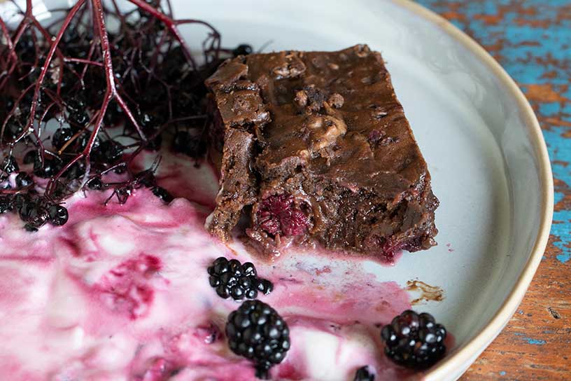 Door de bramen in deze brownies worden ze extra smeuïg. De brownies zijn lekker bij de koffie, maar met vlierbessenyoghurt