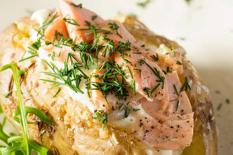 Aardappels worden vaak gezien als een simpel gerecht. Maar pof ze eens in de oven en serveer met een vulling van zalm, zure room en verse dille.