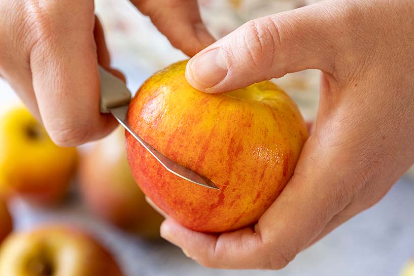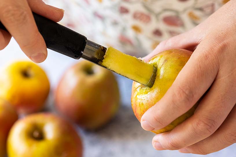 - Snijd de appels over ‘de evenaar’ een stukje in met een scherp mes (dit voorkomt dat ze straks openbarsten in de oven).