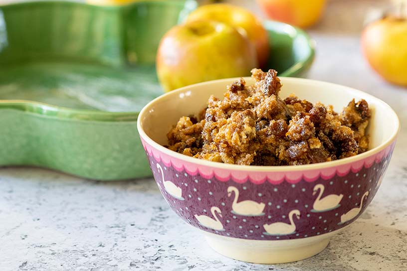 - Vul de holtes van de appels ermee en strooi er wat extra walnoten bovenop.