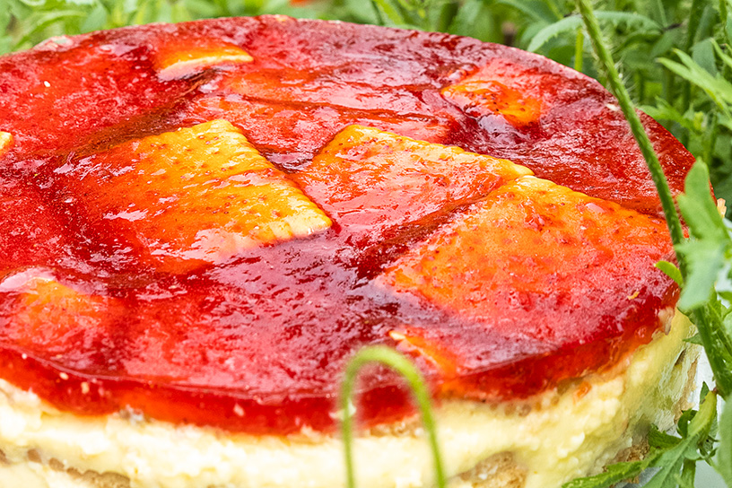 - Verwarm de jam in een pannetje en strijk over de taart.