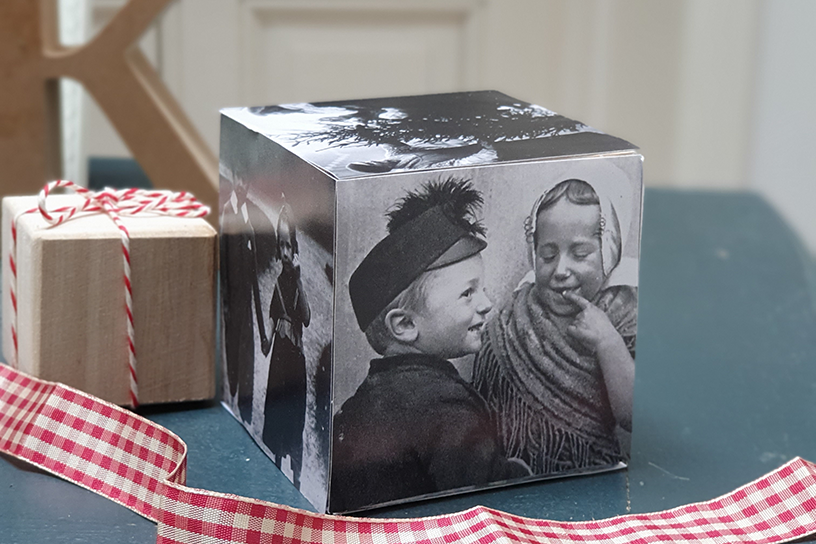 Geef de kerstetagère een persoonlijk tintje met deze fotokubus. Selecteer zes mooie foto’s, of uitsneden van foto’s, en snijd ze zo nodig op maat (10 x 10 centimeter). Plak ze op een houten kubus. Of gebruik een transfertechniek waarmee u de afbeelding overzet op hout. Op youtube.nl zijn meerdere filmpjes te vinden waarin haarfijn wordt uitgelegd hoe je dat doet. Door de kubus elke dag een slag te draaien heb je steeds een nieuwe foto in beeld.