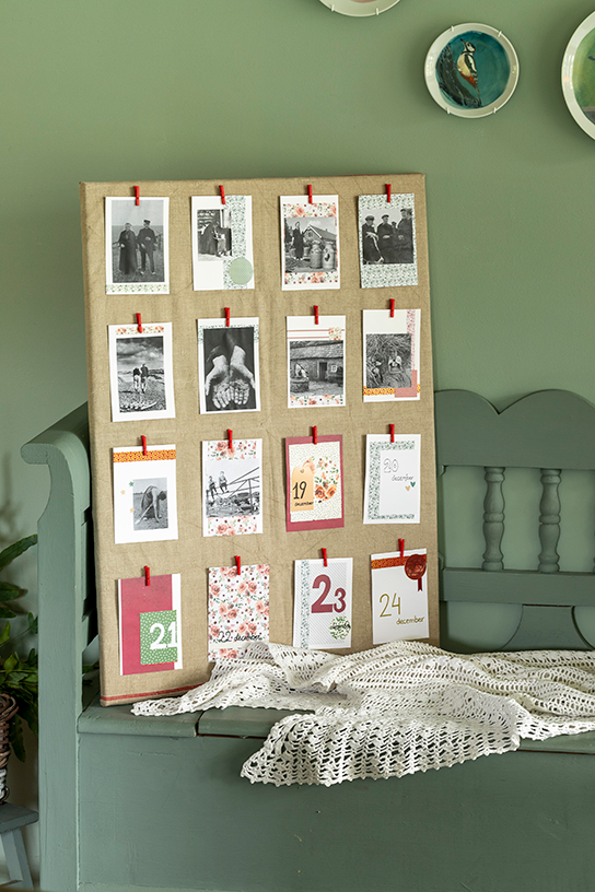 Eens niet dagelijks een piepklein chocolaatje of cadeautje. Met deze adventskalender wordt je de hele advent getrakteerd op een mooie herinnering of een stukje familiegeschiedenis. Bekleed hiervoor een schilderdoek met een neutrale stof. Wij gebruikten hiervoor oud pompdoek. Zet deze met behulp van een nietpistool vast. Koop of maak kaartjes en verdeel deze op gelijke afstanden over het doek. Als niet de hele adventsperiode mooi op het doek past, tel dan met de datums terug vanaf 24 december, de laatste dag van de advent. Zet op de voorkant van de kaartjes de datum. Op de achterkant van elk kaartje komt een mooie oude foto. Bij de start van de adventsperiode zijn alleen de datums in beeld, daarna mag er iedere dag een foto worden omgedraaid. Maak ze vast met een knijpertje, dat u op het doek vastlijmt met een lijmpistool.
