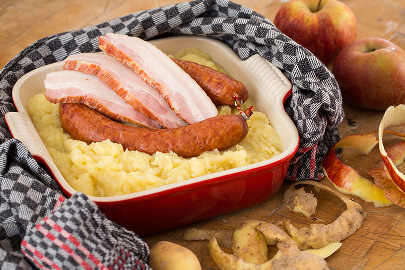 Hete bliksem is een stamppot van appels en aardappels. Voeg je aan het recept ook nog fijne mosterd en ham toe, dan heet het gerecht ‘donder en hete bliksem’.