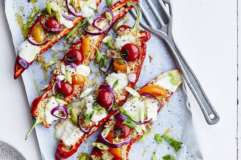 Paprika gevuld met quinoa, burrata en kerstomaatjes