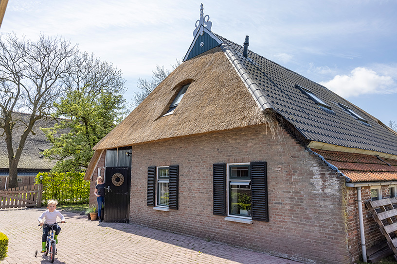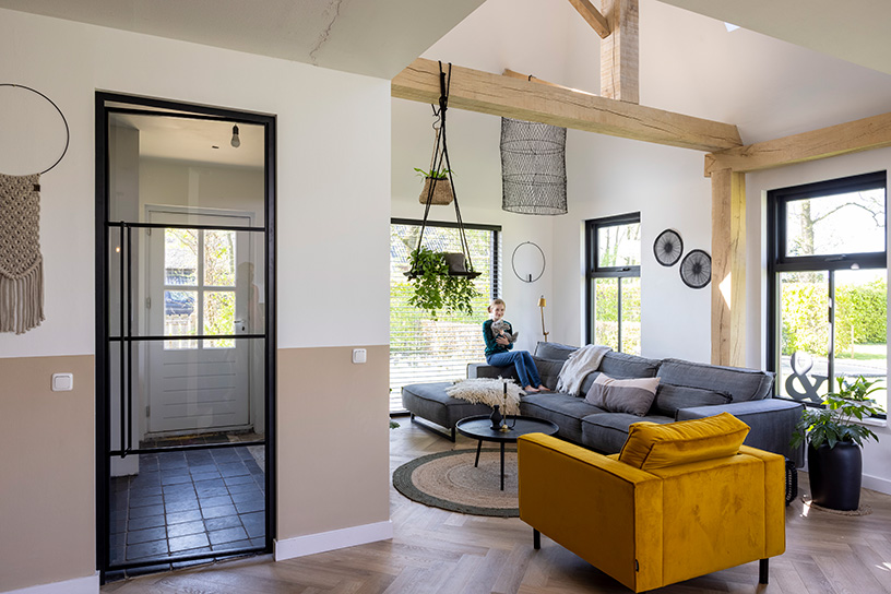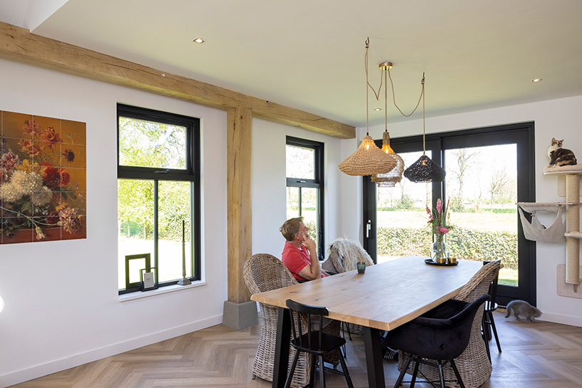 Deze zomer ging de droom van Jitske en Ed Schreuder in vervulling. Twaalf jaar nadat ze hun vervallen boerderijtje in het Friese Ryptsjerk (Rijperkerk) kochten, is ook hun voorhuis bewoonbaar en hebben ze eindelijk hun lang gedroomde woonkamer met volop licht. Jitske: “We hebben eerst het achterhuis opgeknapt. Het voorhuis was echt heel slecht en hing helemaal naar voren. Het middelste stuk van ons huis hebben we eerst tot woonkeuken en woonkamer verbouwd. Tien jaar lang hebben we bij weinig licht naar de wand gekeken die tussen ons bewoonde deel en het nog te verbouwen stuk stond. Tot de coronatijd begon en het ineens heel snel ging. Ed had de muren al opnieuw opgemetseld, maar de afwerking had nog op zich laten wachten. Ook eenvoudigweg omdat het geld op was. Maar in dat jaar wist hij de isolatie, de vloer, de balken en de ramen ook af te werken. Toen we de muur tussen het al bewoonde deel en het voorhuis weg konden halen en het nieuwe stuk bij ons huis kwam, had ik tranen in mijn ogen. Nu hebben we eindelijk het licht en de ruimte die we ons twaalf jaar geleden bij de koop al voorstelden. We hadden al een prachtig uitzicht, nu kunnen we het ook echt zien.”