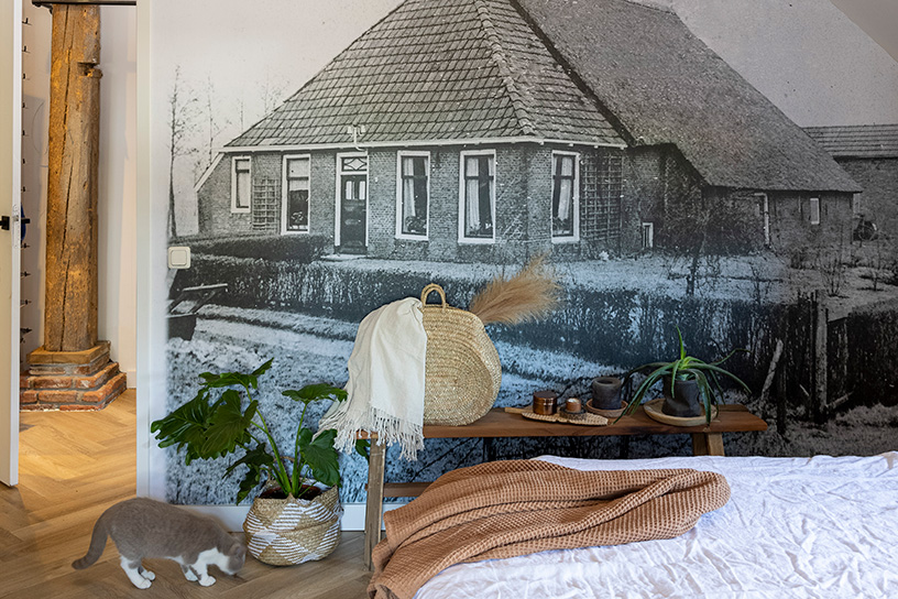 Een oude zwart-witfoto van de boerderij als blikvanger in de slaapkamer.