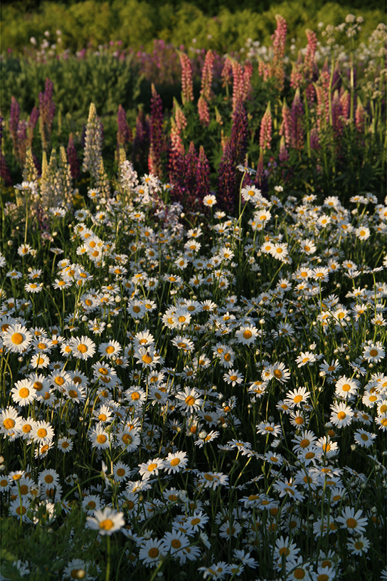 Margrieten, vaste lupines en valeriaan