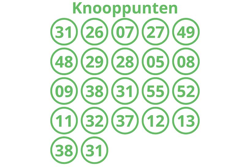 Knooppunten: 31, 26, 07, 27, 49, 48, 29, 28, 05, 08, 09, 38, 31, 55, 52, 11, 32, 37, 12, 13, 38 en 31.