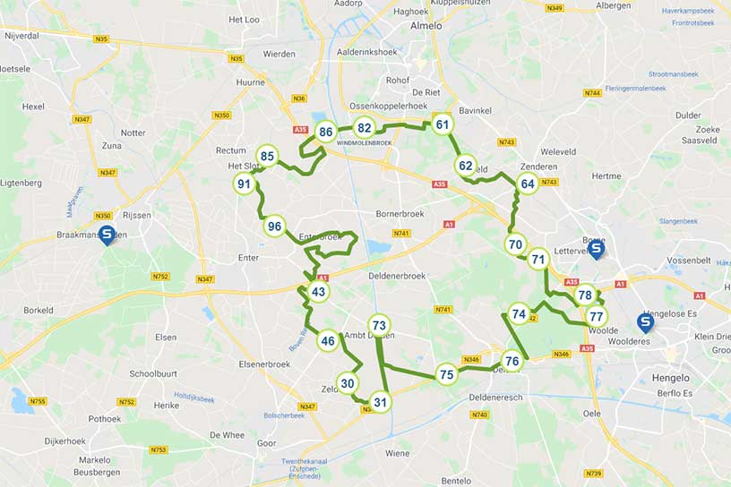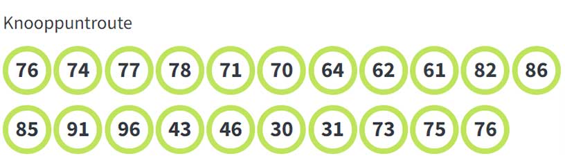 Knooppunten: 76 74 77 78 71 70 64 62 61 82 86 85 91 96 43 46 30 31 73 75 76