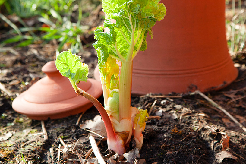 De lichtroze stengels van geforceerde rabarber worden afgedekt en beschermd door een terracotta pot. In de pot is het donker en relatief warm; daardoor kun je eerder oogsten en zijn de stengels zachter, zoeter en delicater van smaak. Met geforceerde rabarber maakt u al vroeg in het seizoen dit heerlijke recept. De vettige makreel combineert qua smaak heel goed met in witte wijn gepocheerde roze rabarber.