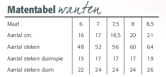 Dit gaat zo iedere toer door totdat de spie 9 steken breed is. Dan worden er elke tweede toer omslagen voor de duimspie gemaakt totdat de spie uit het aantal steken uit de maattabel bestaat. De twee steken voor en na de spie moeten ook gewoon telkens mee gebreid worden.