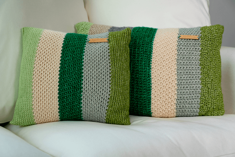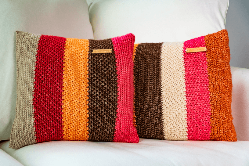 De gehele werkbeschrijving van de kussenhoezen zit in het haakpakket, deze kun je hieronder bestellen. Het pakket bevat materiaal voor een vierkante (40×40 cm) en een rechthoekige (40×60 cm) hoes in kleurbanen met verschillende steken waardoor de hoezen een mooie structuur krijgen.