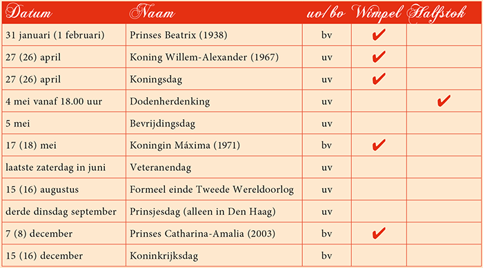 Wettelijk gezien mag je elke dag vlaggen. Toch is het meer gebruikelijk om dat te doen op de daarvoor aangewezen standaardmomenten. Koningsdag bij uitstek! Dan mag ook de oranje wimpel worden uitgestoken. Voor het vlaggen gelden een paar regels. De vlag mag nooit de grond raken en je mag de vlag niet laten hangen tussen zonsondergang en opkomst. Tenzij je de vlag verlicht en deze daardoor goed zichtbaar blijft.