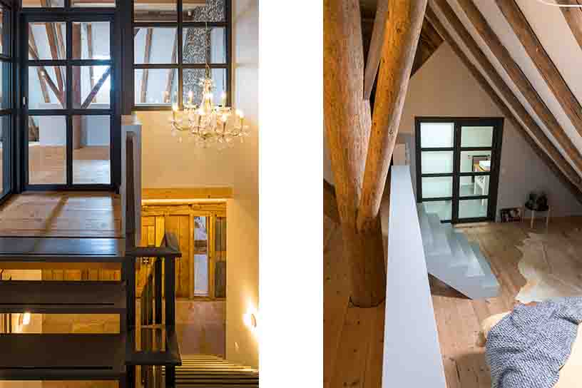 Doorkijkje in het moderne trappenhuis. Beneden is de hal is nog de oude stalwand te zien.