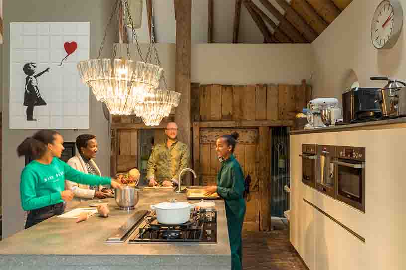 In de keuken vormen 150 jaar oude stenen als het ware een pad richting de achterdeur. De stenen zijn over de lengte doormidden gezaagd, zodat de warmte van de vloerverwarming erdoorheen kan maar de authentieke uitstraling behouden blijft. “Kijk”, wijst Richard, “de keuken staat er deels overheen, zodat je het idee krijgt dat dit pad hier altijd al gelegen heeft. Net alsof de paarden er vroeger overheen hebben gelopen.”