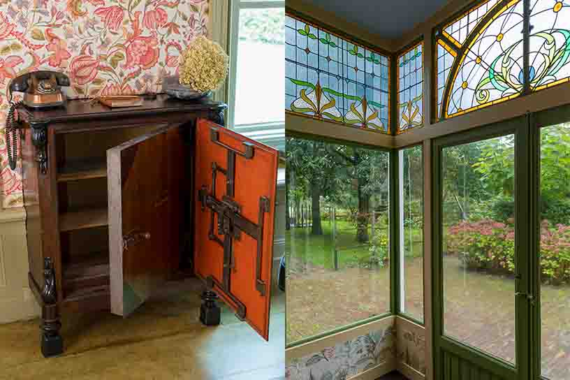 De stalen brandkast op de linkerfoto is gecamoufleerd als houten kastje. Bij de serre op de rechter foto hoort nog een mooi verhaal vertelt Gloria enthousiast terwijl ze de serre laat zien. “Deze serre is door de voormalige eigenaar rond 1920 met paard en wagen opgehaald uit Haren. Hij heeft hem hierheen gebracht en hem zo in één stuk aan het huis vastgezet.”