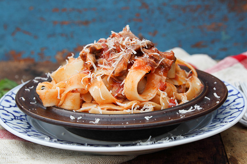 Zet een pan water op en kook de tagliatelle volgens de aanwijzingen op de verpakking (100-125 gram per persoon). Haal eventuele botjes uit de overgebleven kip van het vorige recept en haal het vlees met twee vorken uit elkaar. Warm de saus op en voeg een blikje gepelde tomaten toe. Plet de tomaten wat fijn. Eventueel kunt u wat extra water toevoegen als dat nodig is. Proef en breng op smaak met zout en peper. Giet de pasta af en meng hem door de saus. Serveer met geraspte Parmezaanse kaas.