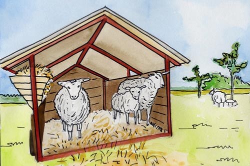 Ook is het in verband met de wisselende windrichting handig om een mobiele schuilgelegenheid te maken. De sleepstal is met een afmeting van 2.50 x 4.50m geschikt voor kleinvee. De hoogte aan de voorzijde is 2.00 m en achter 1.20 m. Groter of kleiner kan natuurlijk ook.
