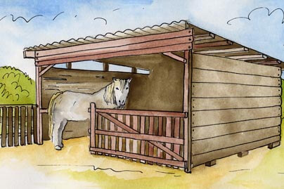 Deze schuilstal heeft een oppervlak van 3.50 x 5.00 m en is geschikt voor twee paarden.