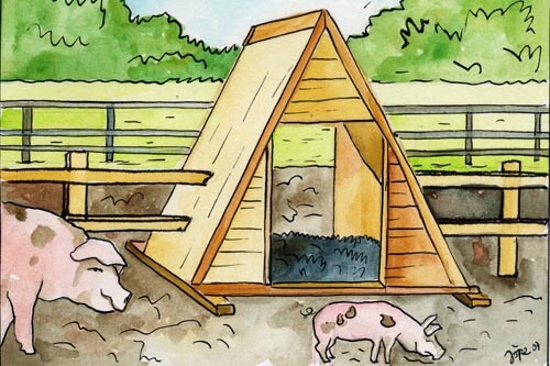 Dit varkenshok van 2.10 x 2.10 m is geschikt voor in de wei. De varkens vinden er beschutting tegen zon en regen. Een houten bodem met daarop een strolaag geeft ze een comfortabel ligbed om lekker te luieren. Het hok heeft aan elke kant een deur, waardoor het oude stro zo naar buiten kan worden geschept, waar het kan dienen als schoonloopmat. Het hok staat op regels, zodat het gemakkelijk verplaatst kan worden, maar het kan natuurlijk ook worden geïntegreerd in het hekwerk tussen twee weitjes in.