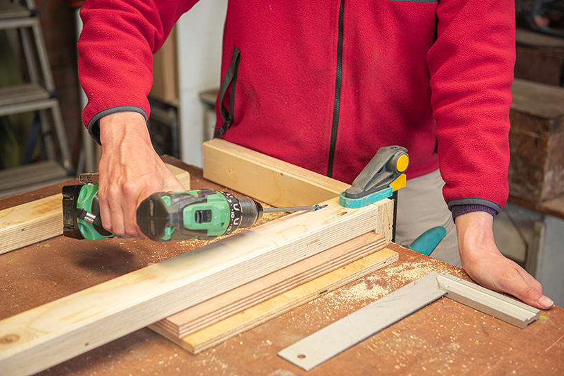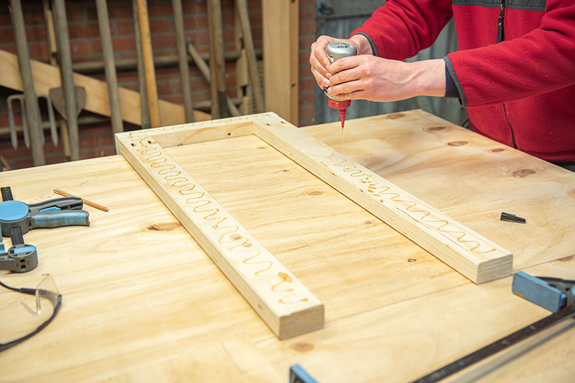 Zaag tweemaal een balkje van 83,5 centimeter lang (A) en een balkje van 40 centimeter lang (B). In staander A boor je met de boormal aan de brede zijde, richting de kopse kant, twee gaten. Dit doe je door de mal en de boor in te stellen op 38 millimeter. Leg B plat op de werktafel, smeer wat lijm aan de kopse kant van A en zet A boven op B, haaks uitgelijnd. Schroef A aan B met twee schroeven (4.0 x 50 millimeter). Herhaal dit voor de tweede staander A.