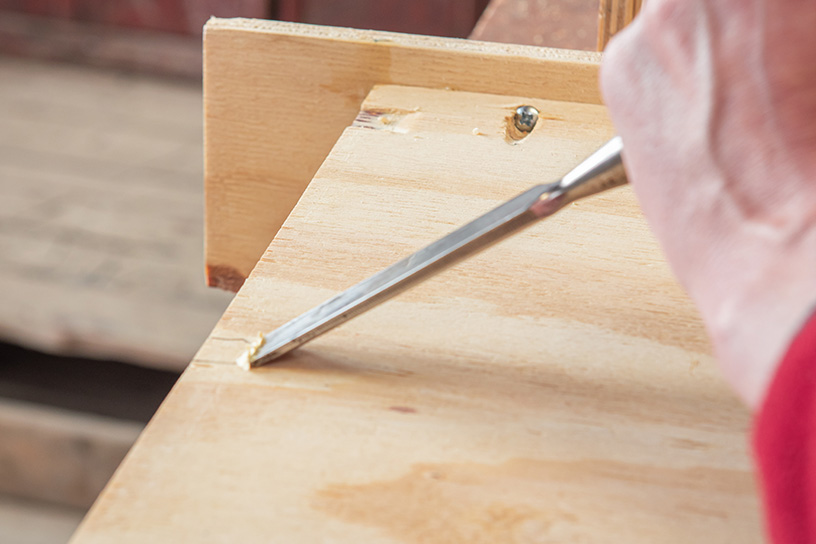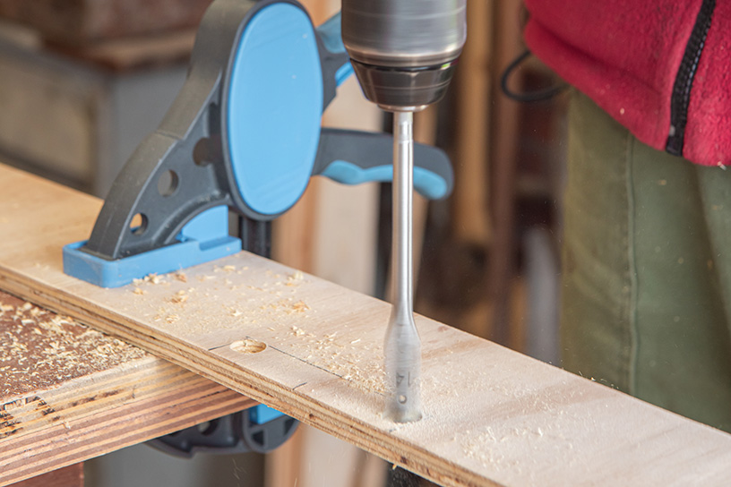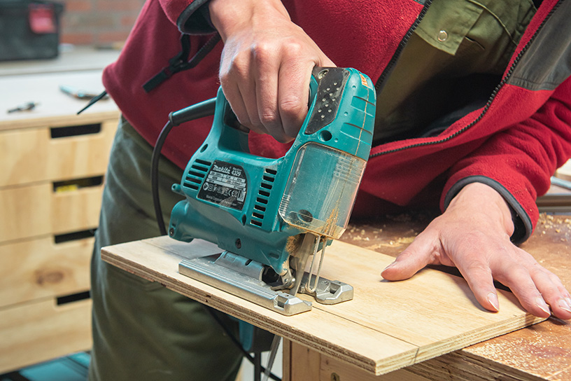 Zaag een stuk multiplex van 59,8 bij 39,7 centimeter (G). Zaag vervolgens een stuk van 7,8 x 59,8 centimeter (H) en tweemaal een stuk van 7,8 x 38,5 centimeter (I). Let er goed op dat de mooie kant van het multiplex aan de binnenzijde van de lade zit – die zie je het meest – en de inkepingen aan buitenzijde. Stel de boormal in op 13 millimeter. Dit is 1 mm meer dan de dikte van het hout waar je mee werkt. Dit komt omdat dit soort gereedschap afkomstig is uit de VS en daar werkt men met inches en zijn de maten van het hout ook iets anders. De oplossing die Nick daarvoor heeft gevonden is dat hij de aanslag ring op de boor 1 millimeter korter instelt dan de 13 die staat aangegeven. Dit zorgt er voor dat de schroef later niet door het hout heen steekt.