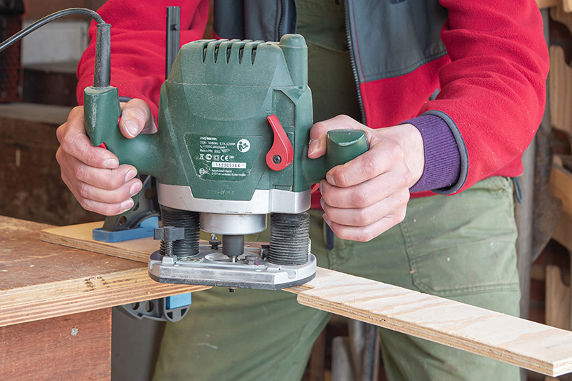 Zaag een stuk multiplex hardhout van 90 x 51,4 centimeter (F). Gebruik een bovenfrees met een ronde kantenfrees en rond alle zijden af, op één lange zijde na. Leg F plat op de werktafel met deze zijde omhoog. Zet het frame er op zijn kop bovenop. Lijn het zo uit dat A op 12 millimeter vanaf de scherpe rand van F is, zodat er ruimte is voor de ladefrontjes. Aan alle andere zijden steekt F 12 centimeter uit. Gebruik de boormal om in elke staander A twee gaten voor te boren; verlijm en schroef A aan F met twee schroeven per staander (4.0 x 50). Tip: test dit eerst in een stuk testhout, zodat je zeker weet dat het goed vastzit en de schroeven niet door het werkblad heen steken. Als ze wél uitsteken stel je het boorblok zo af dat je iets minder diep boort.