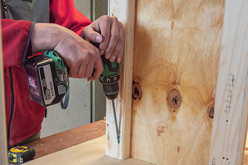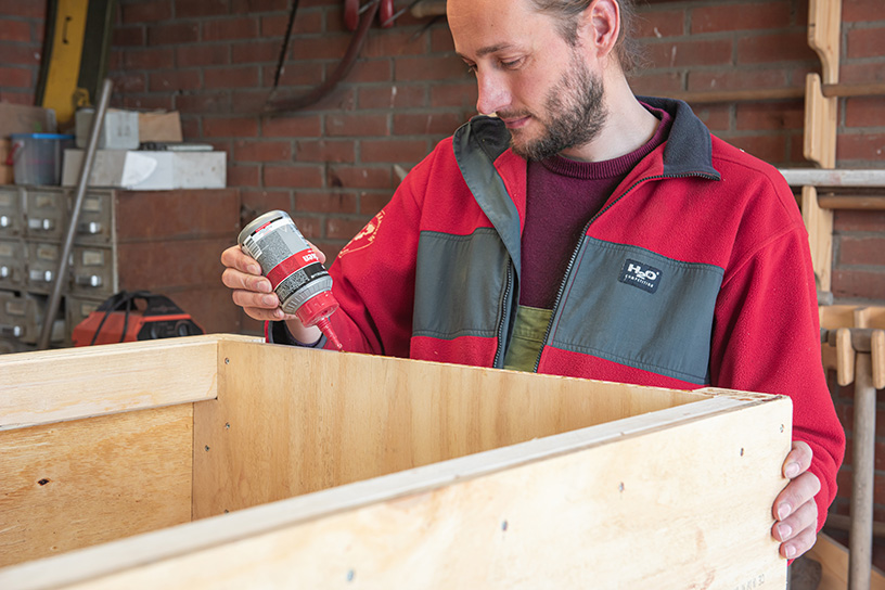 Zaag de grote plaat multiplex die je hebt gekocht eerst over de lengte op 40 centimeter breed door; zaag hier vervolgens een stuk vanaf van 87,5 centimeter lang en 40 centimeter breed (C). Leg het frame op de kop op de werktafel, zodat B naar onderen uitsteekt. Leg C erop met de mooie zijde naar boven: underlayment heeft een duidelijke boven- en onderkant. Verlijm en schroef C aan A en B met vijf schroeven (4.0 x 50) aan elke zijde. Herhaal dit voor het andere zijpaneel.