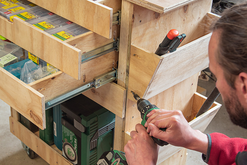 Tot slot plaats je de wielen aan de onderzijde tegen de onderzijde van B. Zet ze zo ver mogelijk naar buiten, dan staat de trolley het meest stabiel. Teken de gaten eerst af en boor ze voor met een 4 millimeter boor. Doe dit 3 centimeter diep, dan trekt de houtdraadbout zich het laatste stuk vast en weet je zeker dat je niet per ongeluk door B heen boort. Als de wielen los staan kan de gereedschapstrolley een beetje wiebelig zijn. Dit kun je verbeteren door te zorgen dat er altijd een aantal zwaardere koffers onderin staan. Let erop dat je, als de laden vol zijn, maar één lade tegelijk opent.