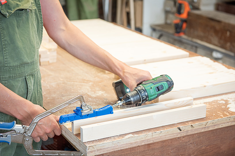 Met een boormal, ook bekend als pocket-hole jig, maak je eenvoudig verzonken boorgaten voor sterke verbindingen. Nick gebruikt de Kreg pocket-hole jig 320. De boormal stel je in op 38 millimeter, de stelring op de boor op 36 millimeter. Plaats de boormal op de voor te boren lat en zet hem vast met een lijmklem. In dit project is dat altijd aan de onderzijde en in de lengterichting van de lat. Plaats de boor in de mal en boor tot de stelring tegen de mal aan komt. Haal de boor draaiend terug, zodat al het zaagsel uit het boorgat getrokken wordt.