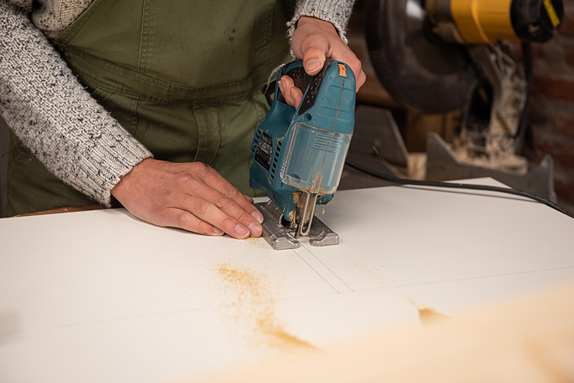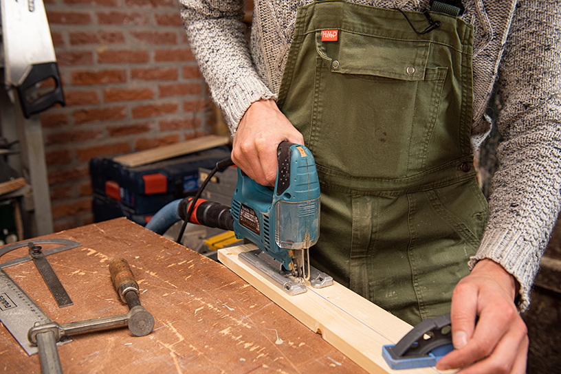 Monteer een hardhoutzaagje in uw decoupeerzaag en zaag tweemaal een stuk compactplaat van 35 bij 33 centimeter (A). De zijde van 35 centimeter zaagt u in verstek onder een hoek van 75 graden (zie tip 1).
