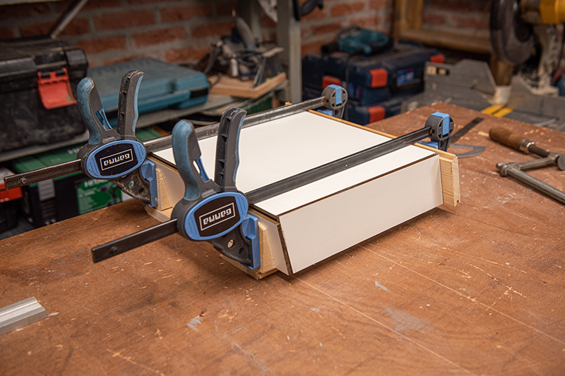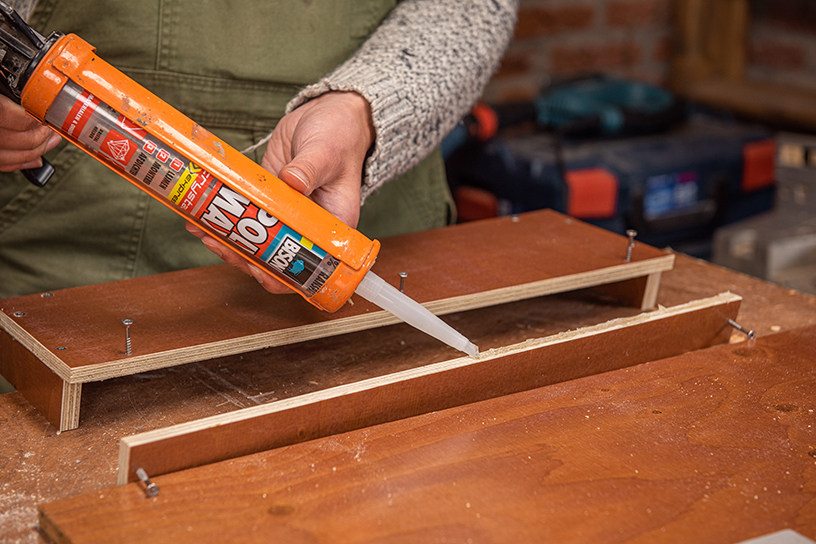 Leg twee latjes van resthout op de werktafel, leg A op de latjes en zorg dat de latjes uitsteken. Zet B haaks tegen A langs de korte zijde van A. Breng op het raakvlak eenzijdig kit aan en druk A tegen B. Zorg dat dit even zo kan blijven staan. Zaag van resthout drie balkjes van 8 centimeter lang. Deze zet u rechtop boven op A; ze dienen als tijdelijke steunpilaren. Neem nu het overgebleven stuk compactplaat A, breng langs de korte zijde kit aan, druk B iets naar buiten en leg A boven op de steunpilaren. Gebruik twee lijmklemmen om B tegen A aan te klemmen. Laat de kit uitharden.