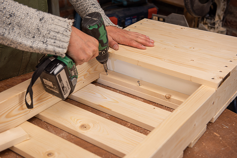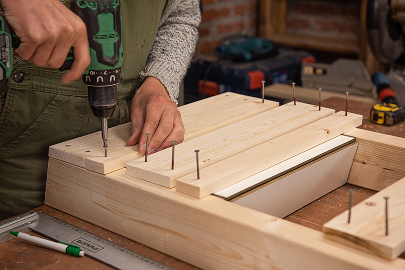 Leg de twee balken D op de lange zijde op de werktafel, met de korte zijde naar boven. Leg het binnenwerk ertussenin; houd aan beide zijden 1 millimeter tussenruimte. Leg plank F haaks boven op D en schroef deze aan beide zijden vast met twee schroeven (4.0 x 50 mm). Al deze schroeven dient u voor te boren met een 3 millimeter houtboor. Zaag nog tweemaal een stuk van 45,2 centimeter. Deze zaagt u over de lengte precies doormidden (G). Leg een plank G tegen F aan en schroef deze aan elke zijde met één schroef vast. Leg hier vervolgens een plank E tegenaan, weer een G en nogmaals een E. Schroef deze planken allemaal vast.
