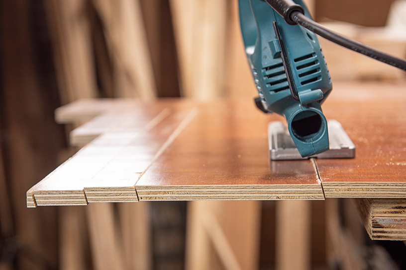 Het deksel is gemaakt van betonmultiplex van 12 millimeter dik. Zaag een stuk van 48,1 centimeter bij 16,1 centimeter (J), waarbij u de lange zijde in verstek zaagt (75 graden). Zaag nog twee stukken van 48,1 centimeter breed en 3,8 centimeter hoog. Ook hier zaagt u de lange zijde in verstek (K). Tot slot zaagt u twee parallellogram gevormde stukken, vergelijkbaar met B maar met de volgende maten: een rechte lijn van 13,9 centimeter lang, dan twee lijnen van 3,8 centimeter lang onder een hoek van 75 graden. De uiteinden verbindt u weer met elkaar (L). Zaag de vorm uit (haaks).