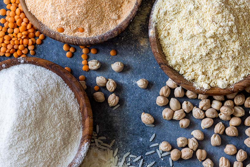 Met de klok mee, vanaf boven af: zelfgemalen meel van rode linzen, kikkererwten en rijst. Van kikkererwtenmeel kan je heerlijke Indiase pannenkoekjes of platte broden bakken, die ook nog eens glutenvrij zijn. Rijstmeel gebruikt je onder andere voor het bestrooien van een houten bakvorm (speculaasplank).