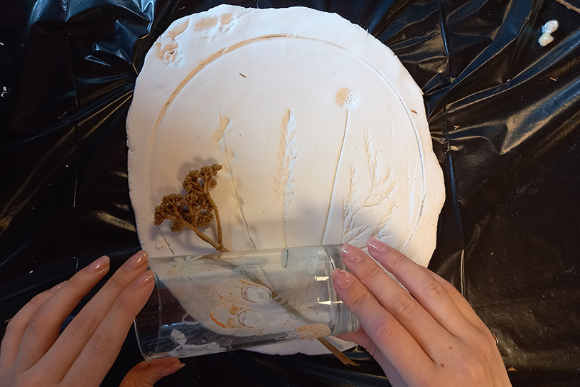 Nu is het tijd om de afdruk van de bloemen te gaan maken. Pak de eerste bloem erbij en leg deze op de juiste plek op de klei. Rol vervolgens voorzichtig met de deegroller over de bloem heen zodat deze aangedrukt wordt. Het is van belang dat de afdruk vrij diep is zodat de verf goed op zijn plek blijft. Wel moet je uitkijken dat er geen gaatje in de klei ontstaat.