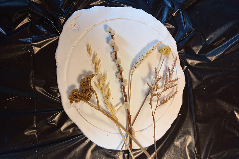 Pak nu de bloemen erbij en leg ze op de klei. Op deze manier krijg je een idee van hoe het eruit zal komen te zien. Als je het fijn vindt, kun je hier een foto van maken zodat je achteraf weet wat voor een idee je had bedacht. Leg vervolgens het voorbeeldidee van de bloemen weer aan de kant, zodat je genoeg ruimte hebt tijdens het maken van de afdruk.