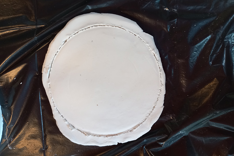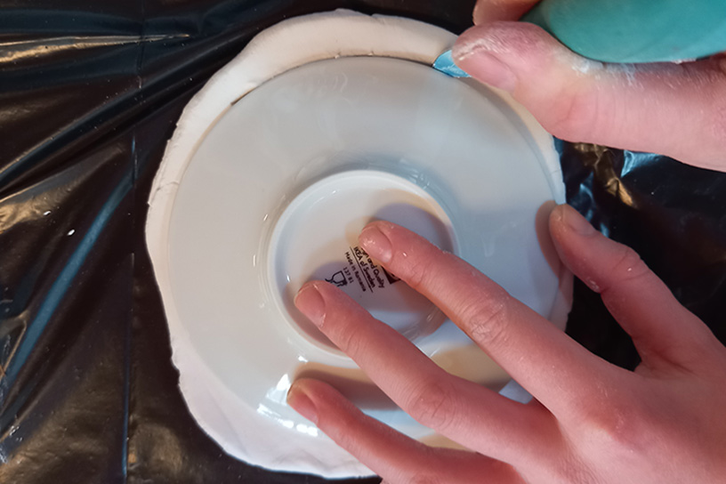 Leg vervolgens een schoteltje of een bord op de klei. Je kunt deze uitzoeken naar grootte waarop je de muurhanger wilt hebben. Verschillende formaten zorgt voor een leuke variatie aan de muur. Snijd met het mes om de rand van het bord heen voor een strakke en nette ronde vorm. De overgebleven klei kan eventueel gebruikt worden voor een tweede, kleinere hanger.