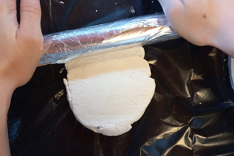 Kneed de klei tot een bal en rol deze vervolgens met de deegroller uit. Voor het geval er geen deegroller in huis is, kan er ook een glas gebruikt worden. Het kan zijn dat de klei wat stug is, in dat geval is het handig om een beetje water aan de klei toe te voegen. De grootte en dikte van de hanger kan naar eigen voorkeur worden bepaald. Wel is het handig om de klei niet te dun uit te rollen zodat deze niet breekt als hij hard geworden is.