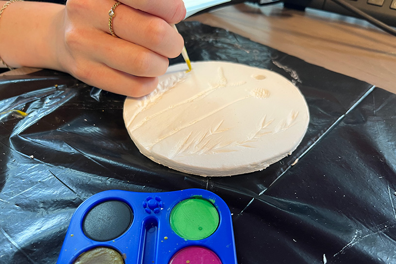 Zodra de klei hard geworden is kan de verf tevoorschijn gehaald worden. Kleur de afdrukken voorzichtig in met de verf. Meng zelf kleuren met elkaar om ervoor te zorgen dat het mooie, natuurlijke kleuren worden. Doordat de verf erg waterig is, stroomt deze snel door de afdruk heen en bereikt deze alle takjes goed. Laat de verf drogen.
