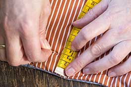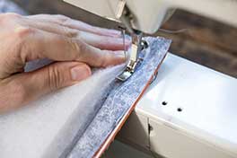 Gebruik ook voor de ‘zijwanden’ een dubbele laag vulling. Indien gewenst kan, om verschuiven te voorkomen, de vulling vastgenaaid worden op de binnenstof. Stik hiervoor de vulling in drie nette rechte lijnen vast op de verkeerde kant van de binnenstof. Leg daarna de beide rechthoekige lappen stof met de goede kant van de stof op elkaar en stik deze aan de twee zijkanten en de bovenkant kort langs de vulling aan elkaar vast. Laat de onderkant nog open. Keer de hoes nu naar de goede kant en duw de vulling netjes tegen de randen en de hoeken.