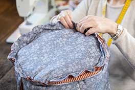 Keer de ‘zijwand’ met de goede kant naar binnen en speld de onderrand rondom vast aan de bodem, zo kort mogelijk langs de vulling. Stik daarna beide delen aan elkaar vast. Om zo kort mogelijk langs de vulling te stikken kunt u gebruikmaken van een rits- of paspelvoetje. Werk de naad netjes af met zigzag- of overlockstiksel.