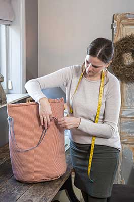 Vouw het biaisband over de hele lengte dubbel en stik het vast. Knip 3 stukjes van 8 cm van het dubbelgestikte biaisband en stik deze vast als lusjes op 3 plekken, gelijkmatig verdeeld op de ‘zijwand’. De bovenkant van de lusjes komt op 9 cm vanaf de bovenrand. Sla de rest van het biaisband dubbel en haal het door de lusjes. Hiermee kun je de pannenstoof afsluiten. De pannenstoof is nu klaar voor gebruik!