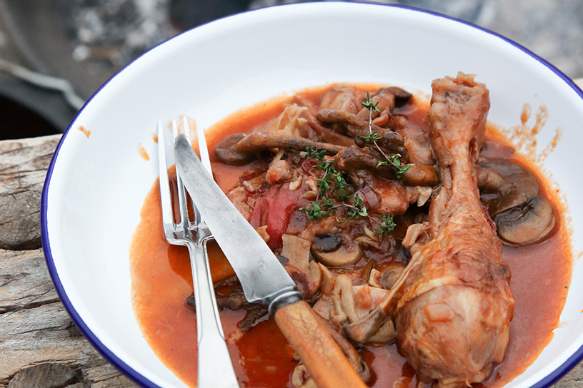 Kip met wijn die wordt gestoofd boven een vuurtje. Door paddenstoelen gebakken met knoflook en tijm toe te voegen heb