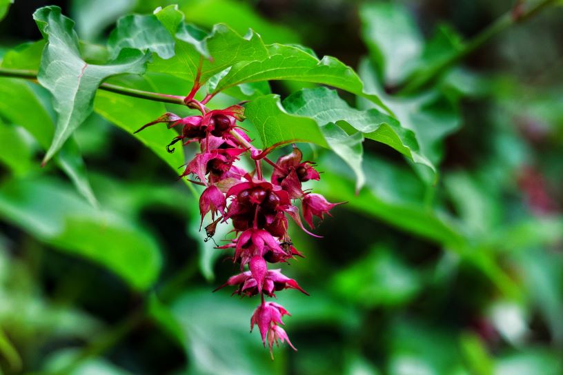 Fazantenbes (Leycesteria formosa) wordt ook wel caramelbes, chocobes of grootmoeders oorbellen genoemd. Die laatste naam dankt de heester aan zijn