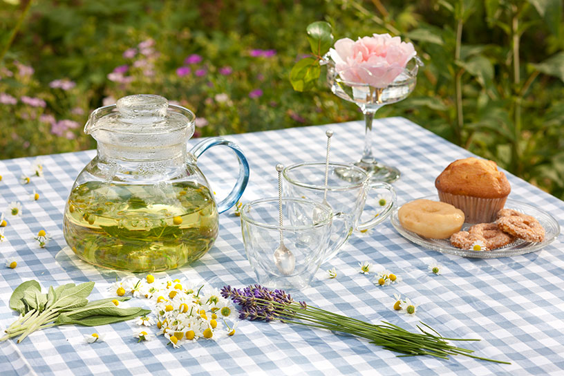 Met verse kruiden en bloemen uit eigen tuin zet je snel een bijzondere pot tuinthee. En heb je de smaak