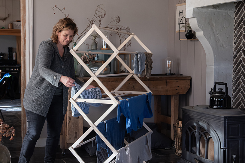 Landleven-timmerman Nick van Zutphen blaast het ‘ouderwetse’ wasrek nieuw leven in. Met dit sfeervolle houten rek drogen kleine wasjes eenvoudig