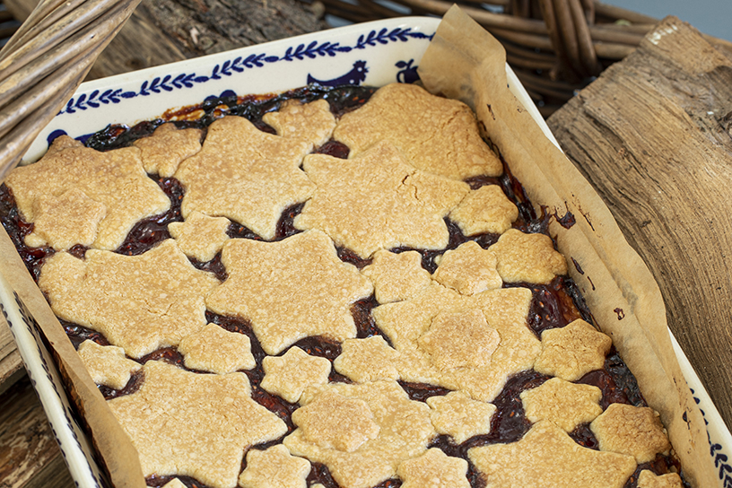 Deze feestelijke plaatkoek bak je met koekjesdeeg en frambozenjam. Ideaal om zo’n schaal vol overheerlijke, boterige stukjes koek klaar hebben