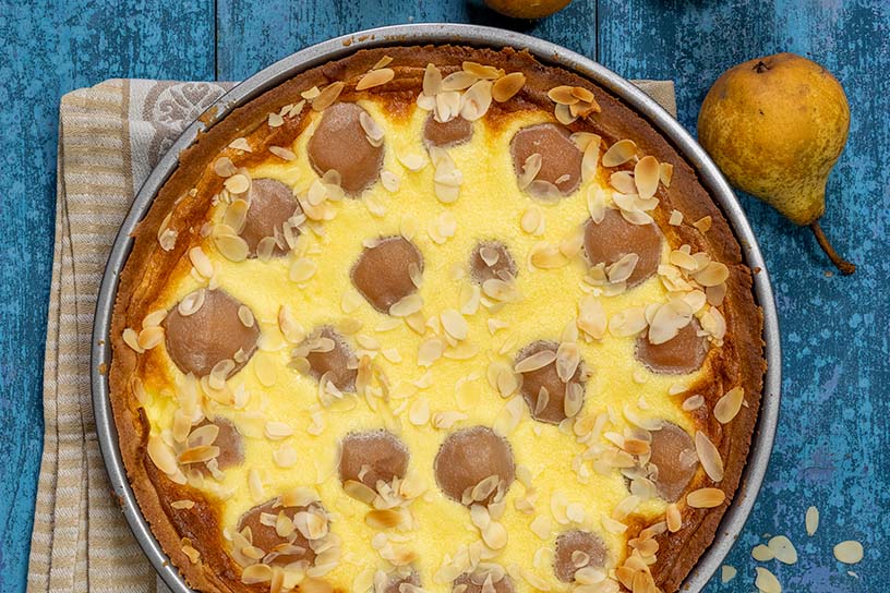 Het is weer eens wat anders: stoofpeertjes in een taart. Lekker met amandelspijs en een romige vulling van crème fraîche.